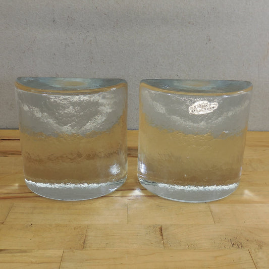 Blenko Glass USA Pair Half Moon Bookends Clear Blue Tint Label