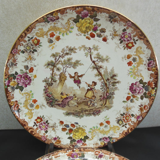 Mintons England Antique Pair 15" Chargers Platters Children Playing Swing Dog