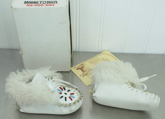 Minnetonka Vintage Infant Child Moccasins Fur Beaded Deerskin Leather Shoes 4 1/4" Sole