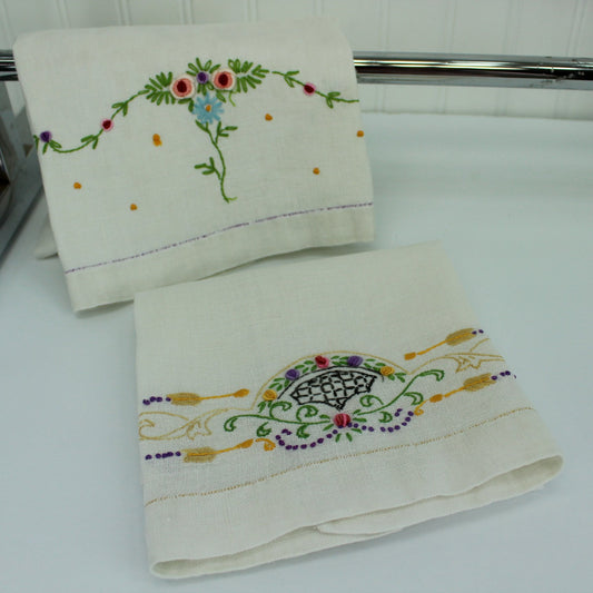 Pair Vintage Linen Hand Towels Exquisite Dimensional Embroidery 1940s Collectible