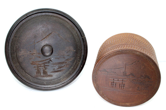Pair Oriental Vintage Wood Boxes Trinket Jewelry Powder Box