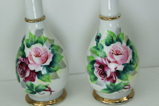 Pair Nasco Vases Made Japan Roses Gilt Mid Century Hand Paint Orig Labels