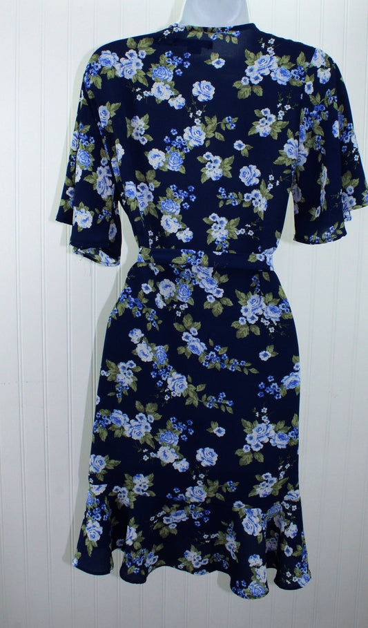 Paper Tee Dress Navy Roses Print Flouncey Sassy Belted Plunge Neck