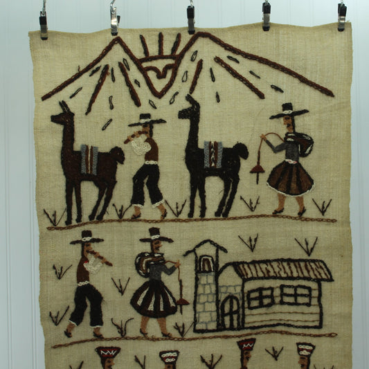 Peruvian Story Tapestry Hand Embroidered Wall Hanging Llamas Dancers Fisherman