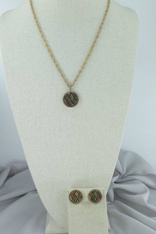 Sarah Coventry Necklace & Clip Earrings Set - Discs Moss Green Deep Red Gold - 23"