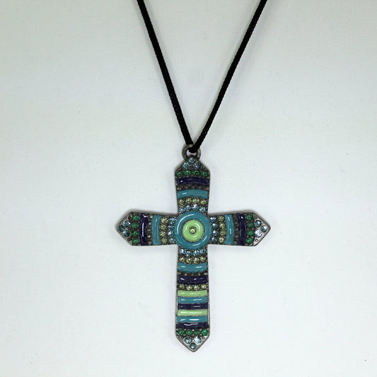 Highly Decorated Rhinestone Crystal Cross Metal Enamel Blue Green Turquoise