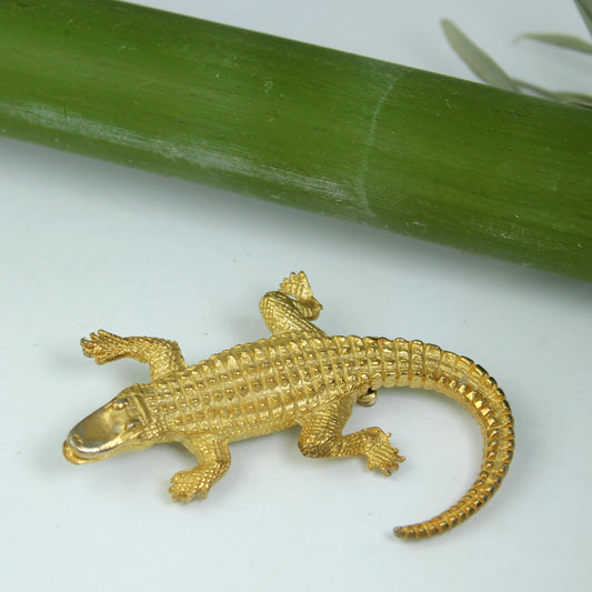Highly Detailed Alligator Pin Brooch Bright Gold 2 3/4" Length
