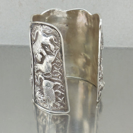 Indo Persian Antique 925 Sterling Silver Cuff Bracelet Repousse Deer Lion Deity