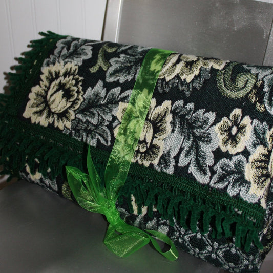 Jacquard Green Black Wool Cotton Tapestry Travel Rug Blanket - Heavy Fringe 53" X 74"