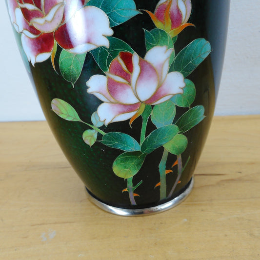 Japanese 6" Vase Green Ginbari Cloisonne Pink Roses Made In Japan