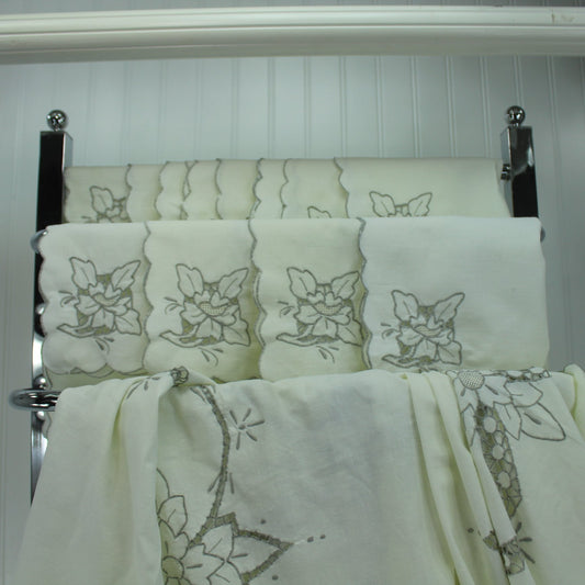 Large Off White Linen Tablecloth 12 Napkins Cut Work Embroidered 63" X 97" Mid Century