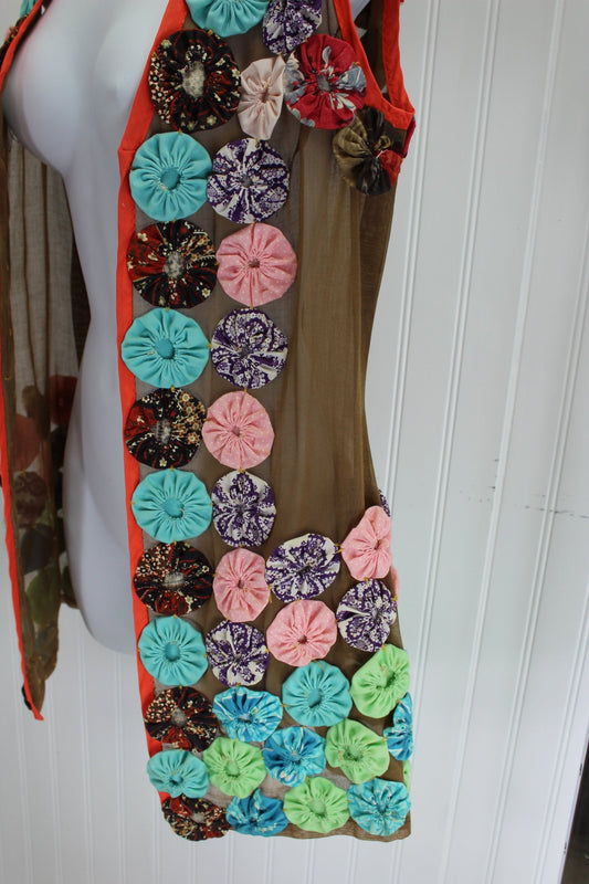 Unbranded Vest Hippie 1950's Brown Organdy Multi Color YO YOs Gypsy Boho
