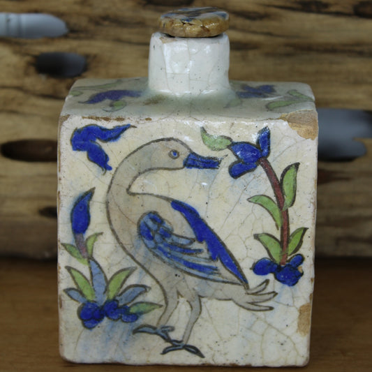 Old Iznik Turkey Bottle Flask Decanter with Stopper Bird Flowers