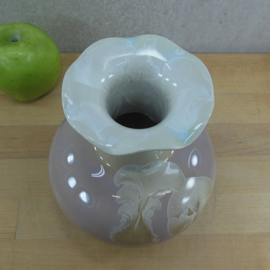 Unsigned Crystalline Pottery Vase Ruffled Rim Blue Tan Mauve