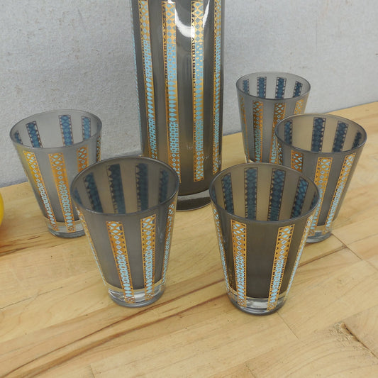 Georges Briard Smoked Glass Cocktail Pitcher Set 22K Gold Aqua Geometric