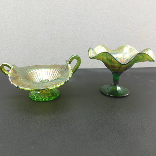 Northwood Fenton Carnival Glass Bon Bon Bowl & Compote Gold Green Peacock