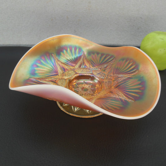Dugan Ski Star Marigold Peach Carnival Glass Tri-Cornered Bowl 8"