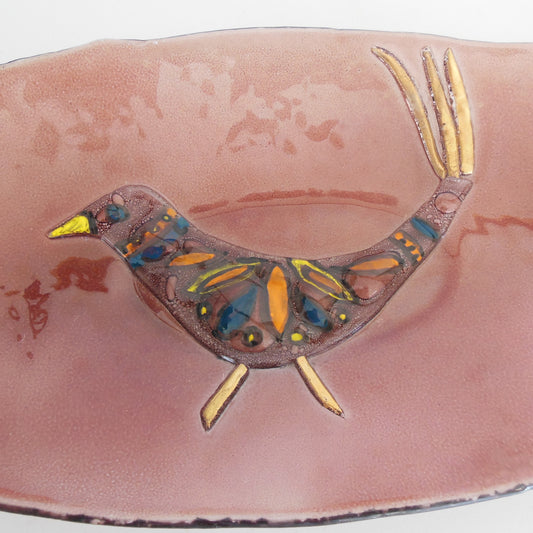 Unsigned Fused Enamel Glass Bird Oval Tray Platter Dish Purple/Brown 15.5"