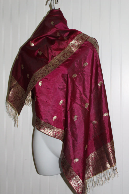 Unbranded Embroidered Scarf Shawl Fuchsia Silk Gold Threads 21" X 68"