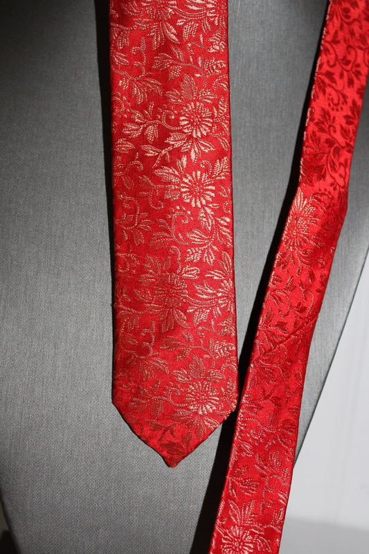 Unbranded Silk Necktie Skinny Japan Silk Metallic Red Flowers 2"