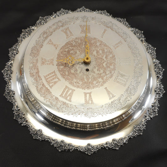 Silver Plate Engraved 16.5" Wall Clock - Ornate Roman Numerals