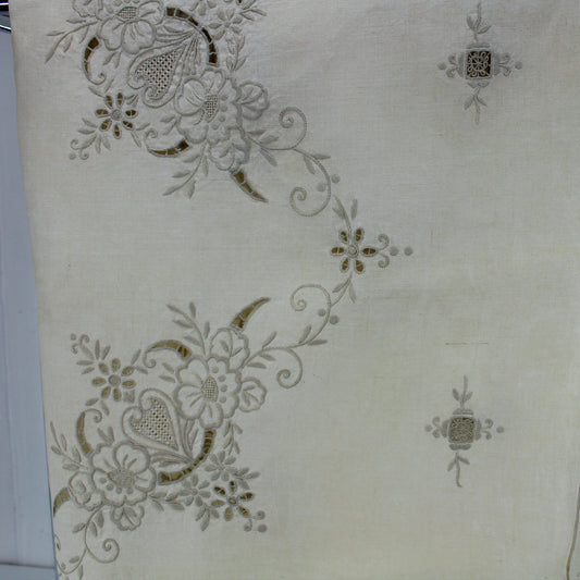 Natural Color Small Tablecloth Linen Embroidered Scallop Edge Open Lattice Work