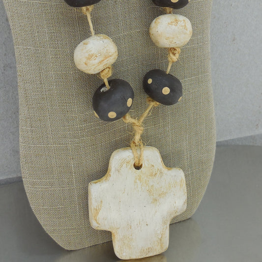 Tribal Chunky Ceramic Pottery Bead Cross Necklace Black White Twine