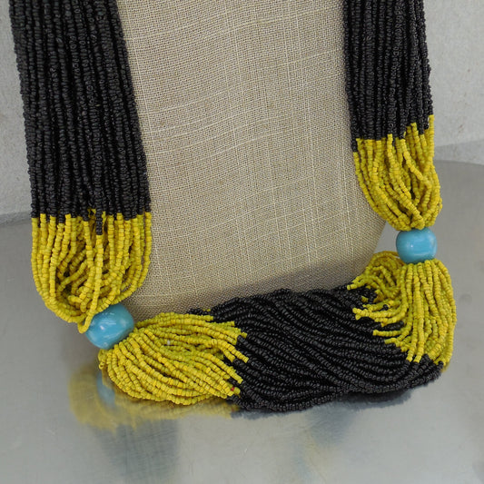 African Style Heavy Glass Seed Bead Necklace Yellow Black Turquoise Tribal