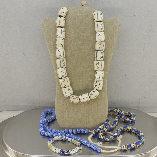 African Trade Ceramic Bead Necklace 3 Lot & Bracelet Tribal