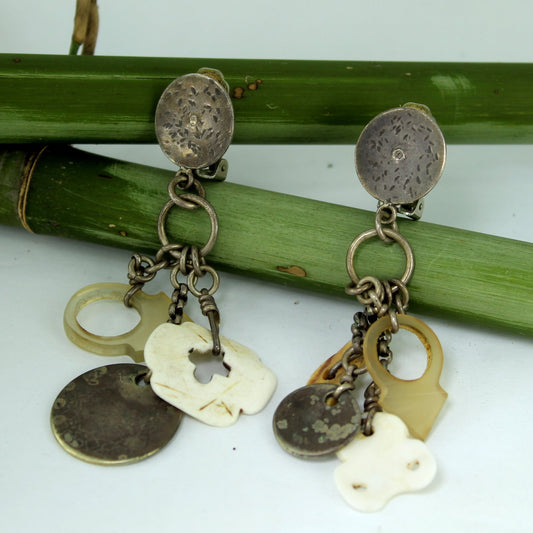 Vintage African Tribal Big Earrings Dangle Metal Shell Bone Coin Charms