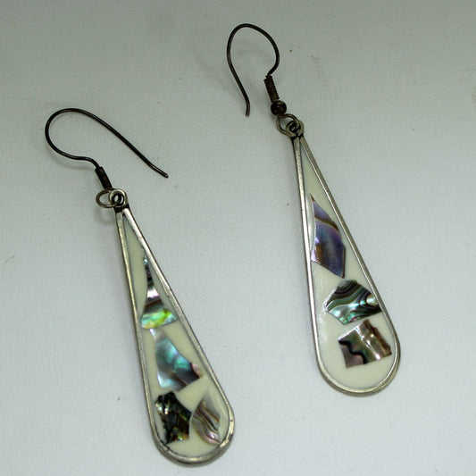 Abalone Alpaca Earrings Large Teardrops Wire Hook Vintage Mexico