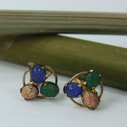 CC Mark Scarab 3 Stone Screw Earrings Mid Century 1/20 12K GF