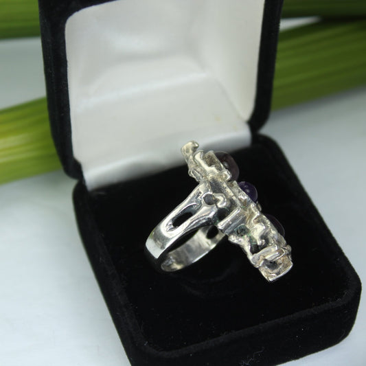 Gem-Craft Modernist Brutalist Large Free Form Sterling Amethyst Color 3 Stone Ring
