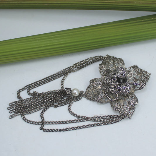 1928 Jewelry Company Filigree Pin Onyx Pearl Chains