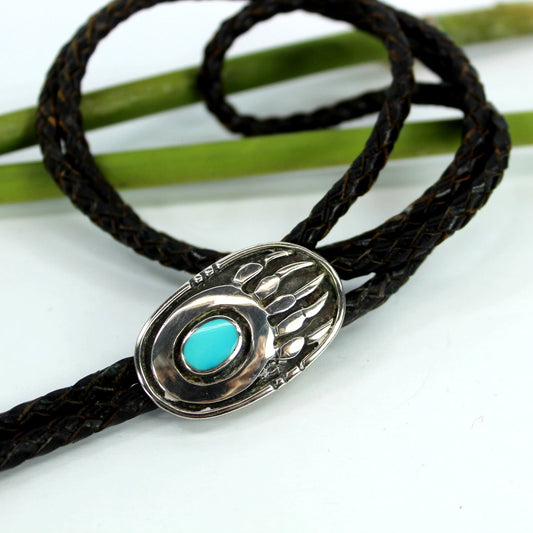 Navajo Bolo Silver Turquoise 1950-60's Bennett Clasp Fine Oval Bear Claw