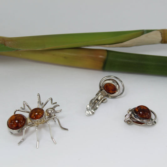 Amber Sterling Spider Pin Amber Sterling Clip Earrings