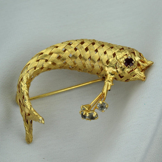 Fish Pin Woven Gold Tone Rhinestone Eye Fin