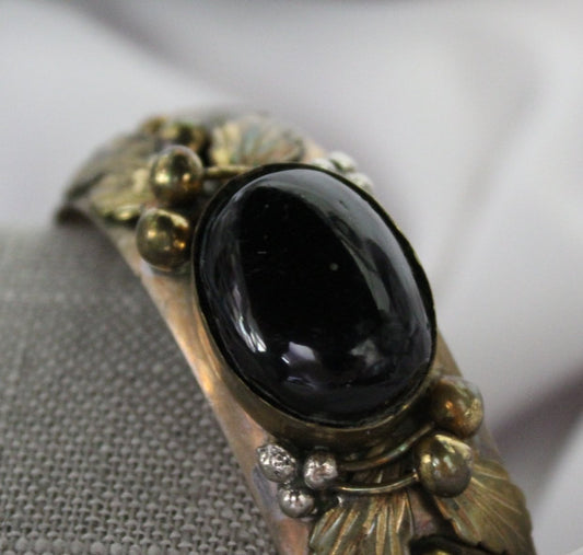 Ethnic Bracelet - Multi Metal Large Black Stone Applied Leaves Berries