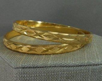 Brushed Gold Tone Etched Bracelets - Pair (2) Vintage Stackable