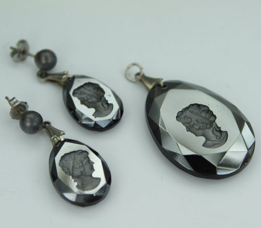 Black Glass Intaglio Pendant & Post Earrings Set Carved Heavily Faceted
