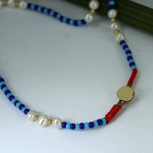Roxanne Assoulin Necklace Blue Beads Pearls Classic Button Fastener Logo