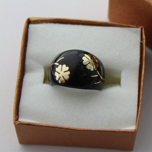 Black Lucite Ring Gold Flower Inlay Exquisite Dome Promise Ring