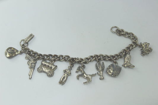 Southwest 1940's Charm Bracelet White Metal - Cowboy Boot Horse Cactus Chief