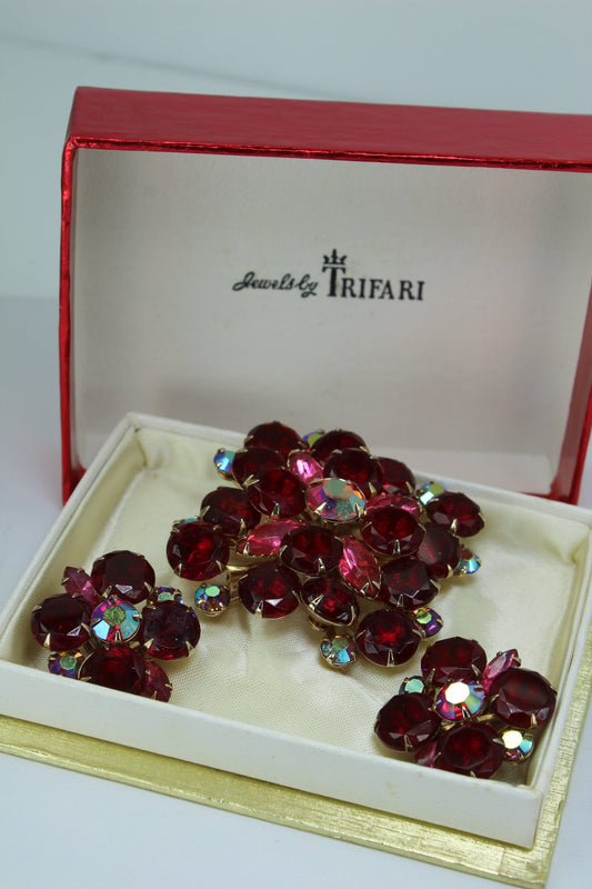 Trifari? Pin & Earrings Boxed Set - Unmarked Brilliant Ruby Red Rhinestones Aurora Borealis