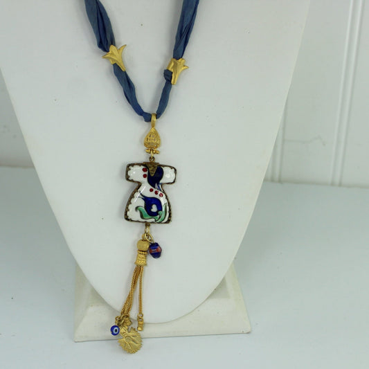 Unique Silk Ribbon Necklace 925 Vermeil Tassel Porcelain Focal