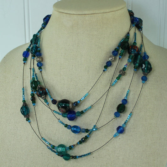 Shiny Iridescent Beads 5 Strand Wire Necklace Shades Blue Turquoise