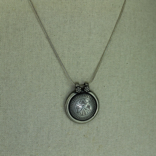 Vintage Tribal Necklace Silver Etched Round Floral Medallion Double Bail Chain