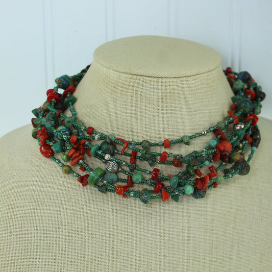 Turquoise Coral Glass Bead Multi Strand Necklace Large Double Medaliion Closure Vintage
