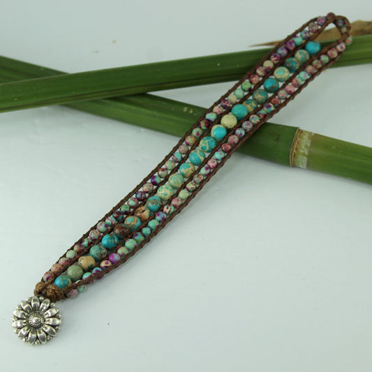 Artisan Bead Bracelet 3 Row Leather Cord Button Closure Turquoise Purple