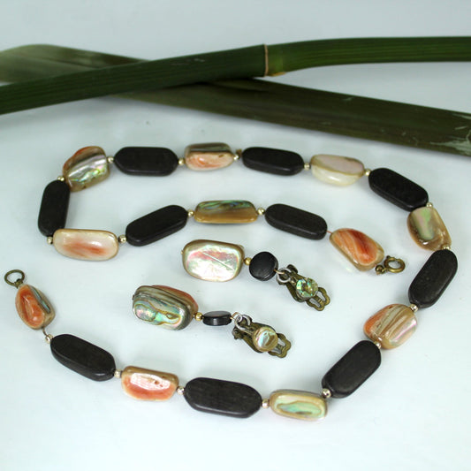 Vintage Abalone Shell Set Necklace Clip Earrings 1950s Japan